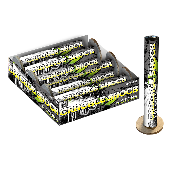 Set van zes stuks Crackle Shock fonteinen. Zeer heftige fluit, gevolgd door een mega heftige knetterwolk. Erg in trek bij de jongere vuurwerkafstekers! De nieuwe hype!